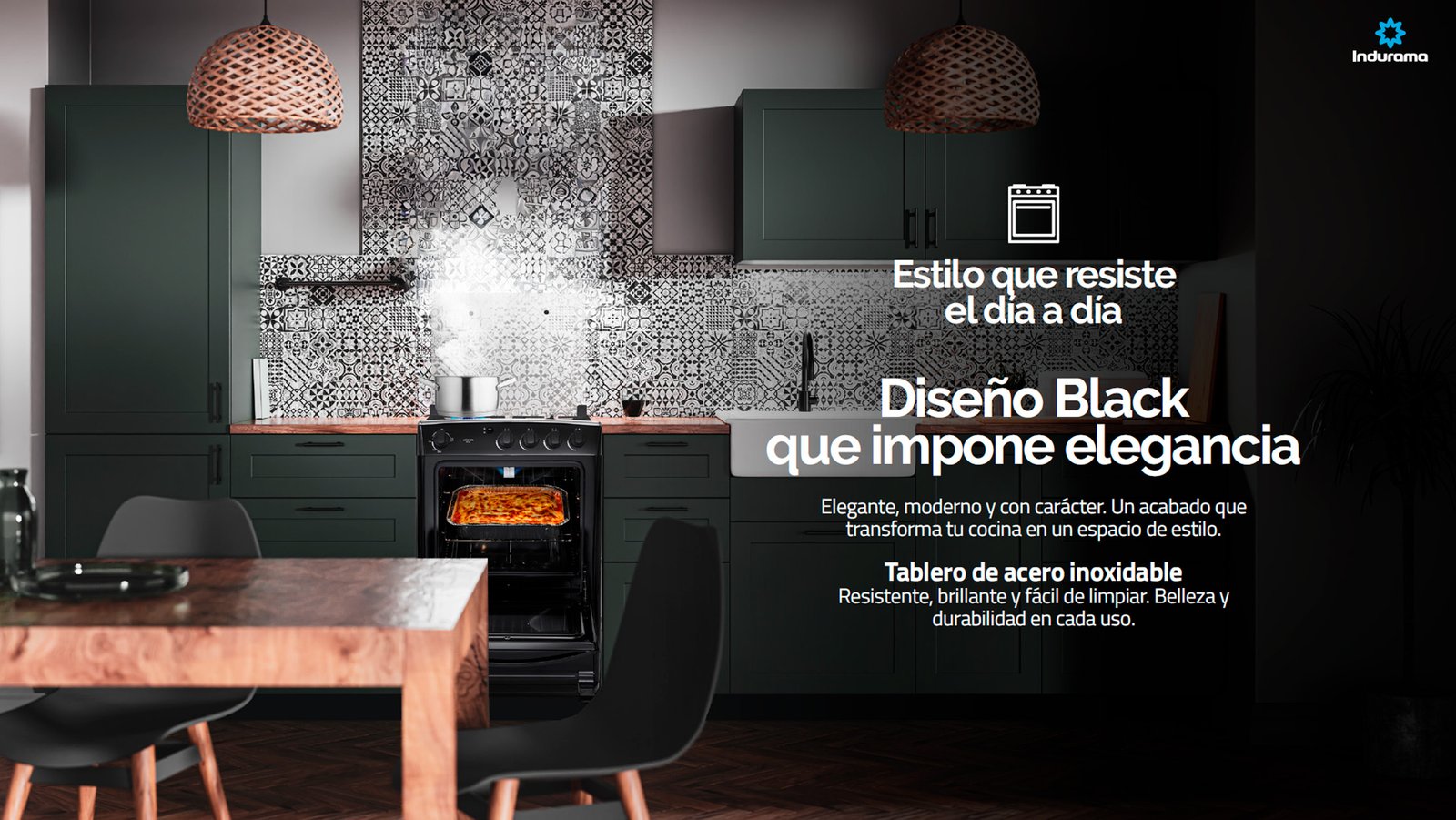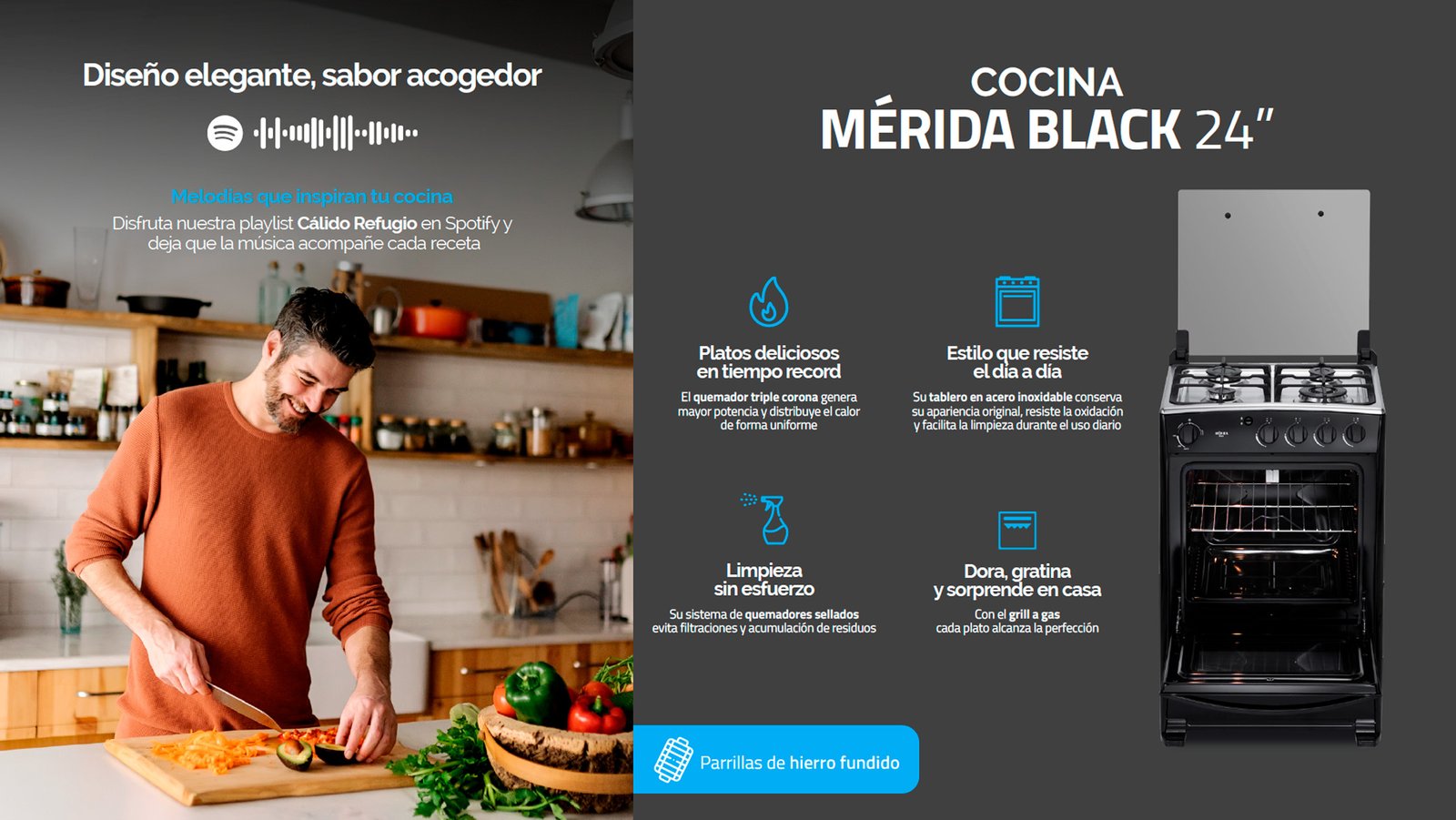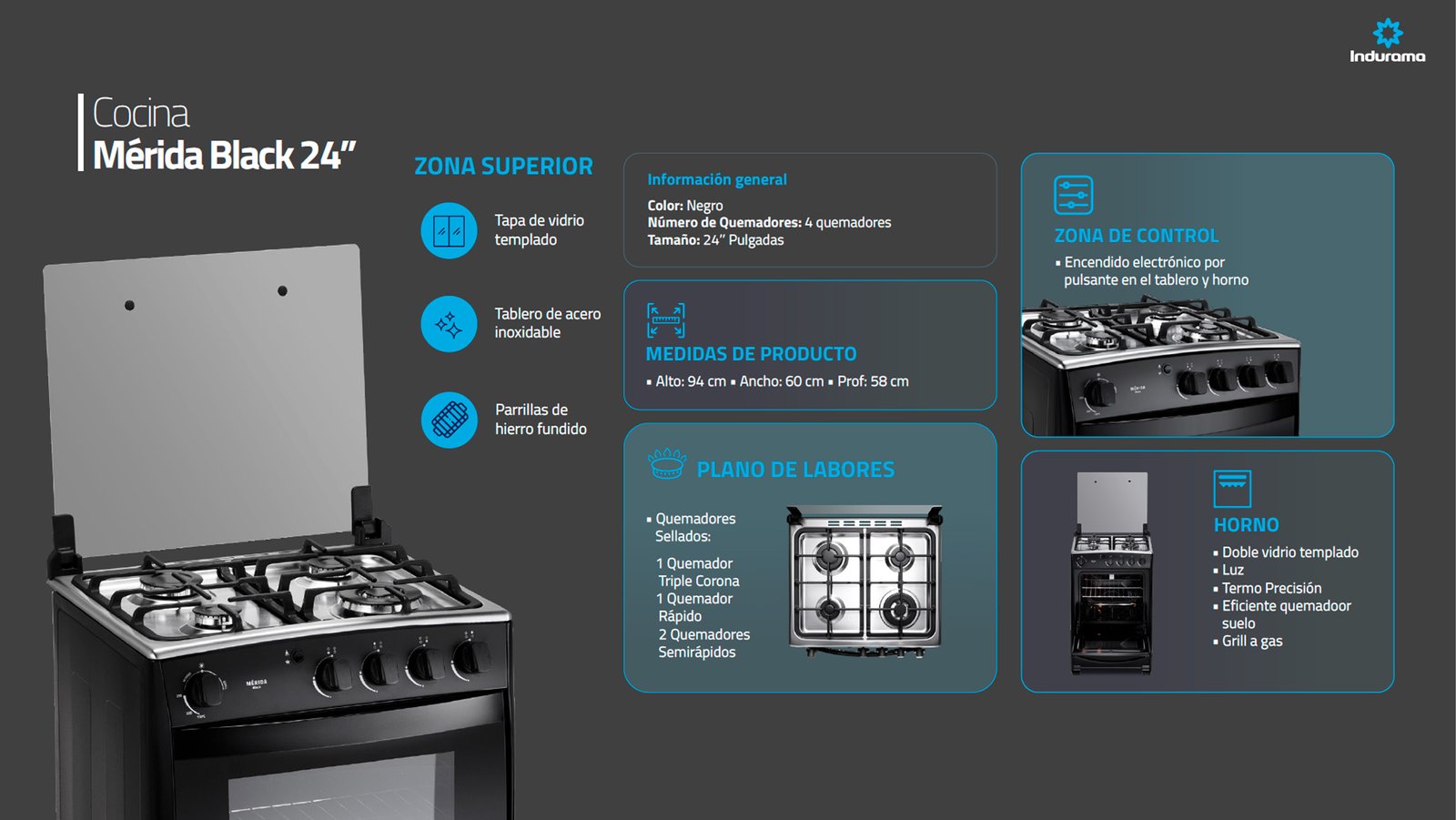 Cocina Mérida Black 24” con quemador triple corona, grill a gas, tablero en acero inoxidable y parrillas de hierro fundido. Diseño elegante, limpieza fácil y potencia para recetas perfectas.