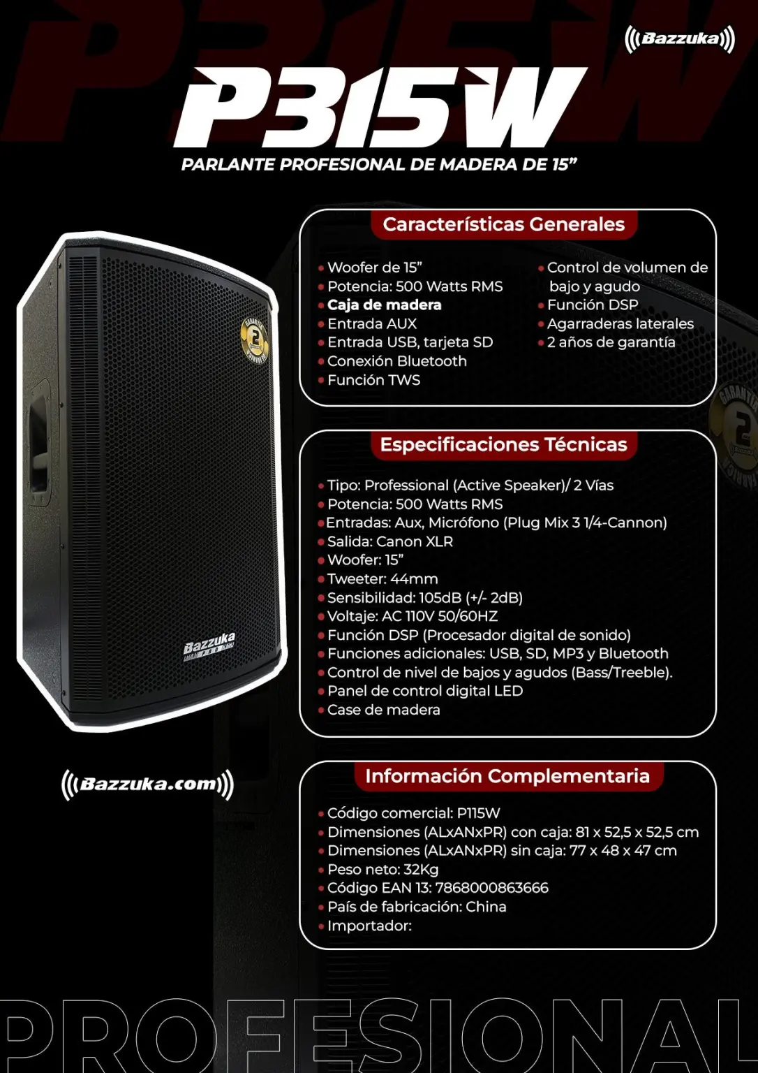 Parlante Profesional Bazzuka P315W | 500 Watts RMS